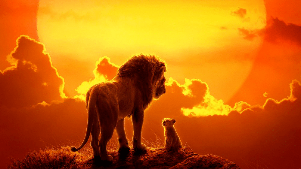 En éste se puede ver un fondo anaranjado rojizo, el acantilado icónico de la película animada y el pequeño Simba con su padre, Simba.