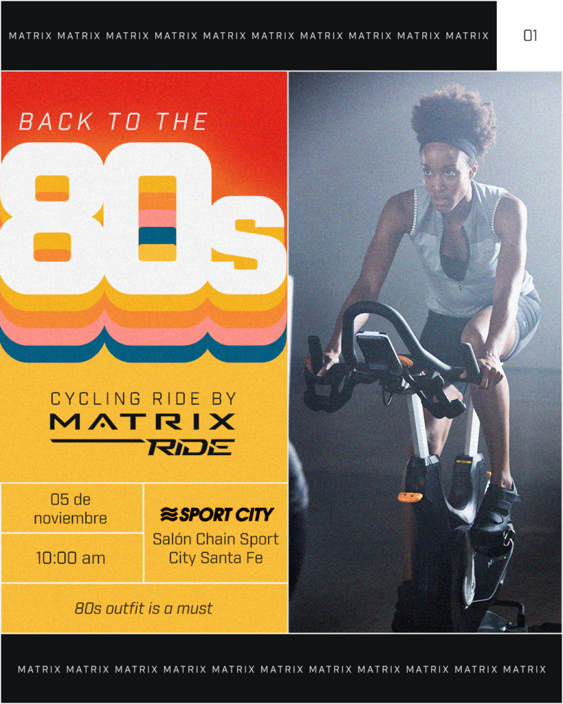 Matrix Fitness estará recibiendo a todas aquellas personas que deseen entrenar con ellos el próximo sábado 5 de noviembre en Sport City Santa Fe en punto de las 11 de la mañana. Además, invita a todos los participantes, y socios del Sport City Studio, a que asistan con su mejor “look” deportivo de los años ochenta, para vivir una experiencia completa.